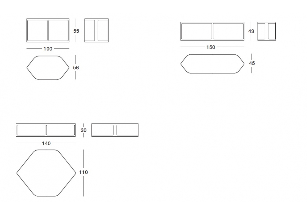 | Abmessungen | 150 x 45 x H 43 cm; 100 x 56 x H 55 cm; 140 x 110 x H 30 cm. |