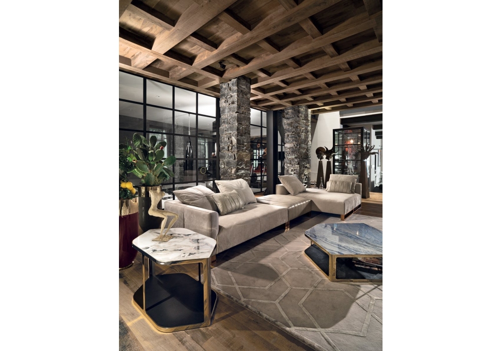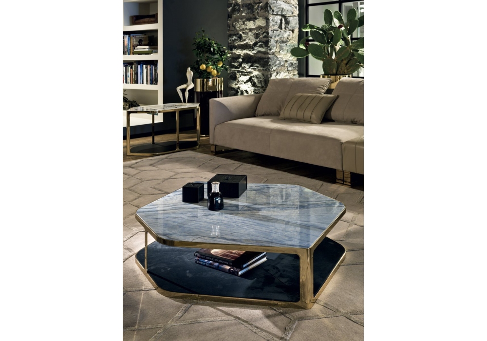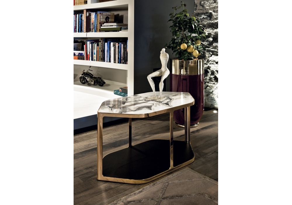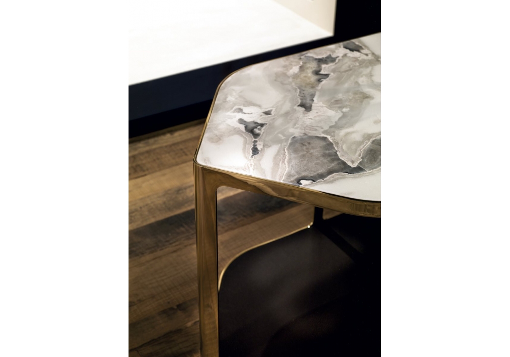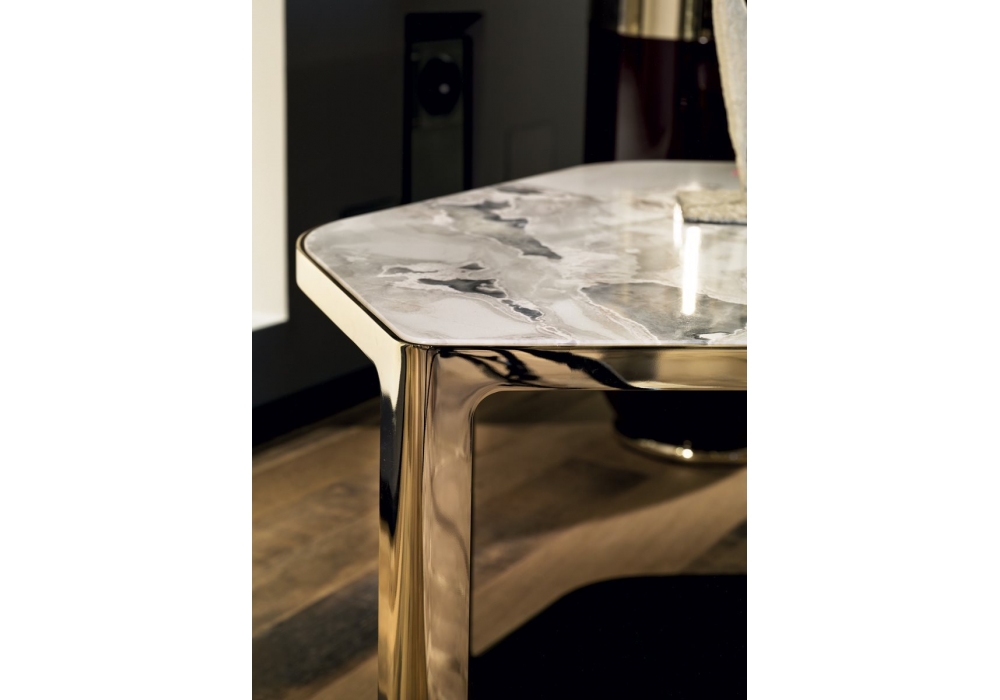 Tiles von Giuseppe La Spada für Longhi entworfen, ist ein Couchtisch mit lasergeschnittener Metallstruktur in glänzender oder matter Ausführung, Marmor-, Spiegel- oder Onyxrohr und mit Leder bezogener Basis. Verfügbar in verschiedenen Abmessungen.