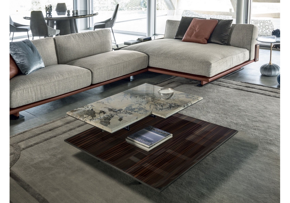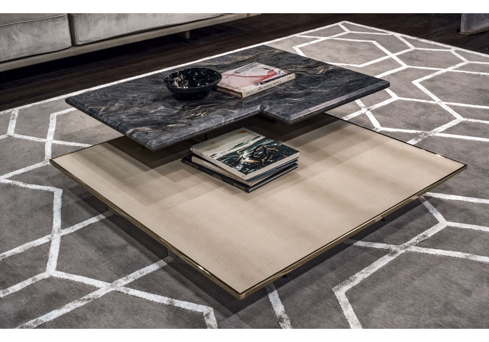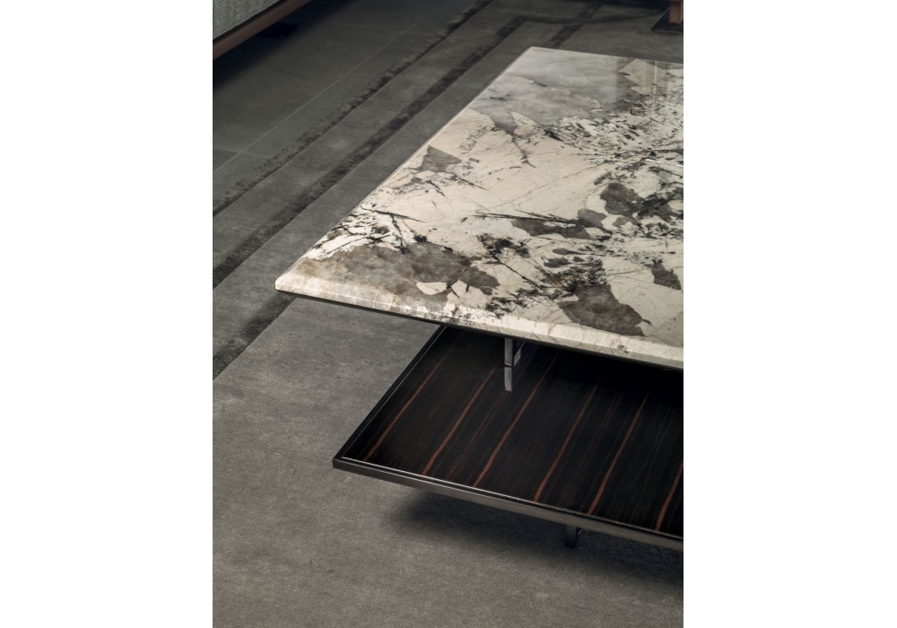 Walt von Giuseppe Viganò für Longhi entworfen, ist ein Couchtisch mit Platte aus Marmor oder Spiegel, unterer Platte aus Holzfurnier oder Leder mit Anti-Flecken-Behandlung und Metallteilen in glänzender oder matter Ausführung. Verfügbar in mehrerer n Abmessungen.