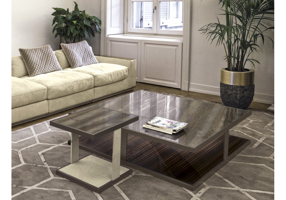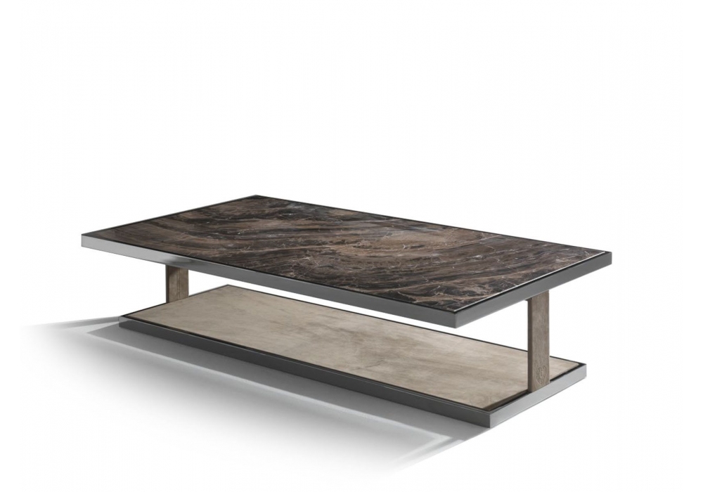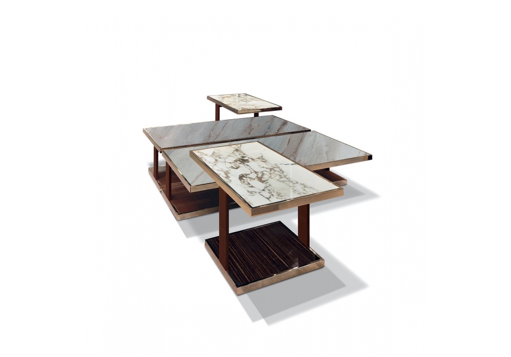 Layer von Giuseppe Viganò für Longhi entworfen, ist ein Couchtisch mit Metallstruktur, Platte aus Marmor oder Onyx und unterer Platte aus Holz oder mit Leder bezogen - Säulen aus Leder oder auf Anfrage in der gleichen Farbe wie die Struktur. Verfügbar in mehreren Abmessungen.
