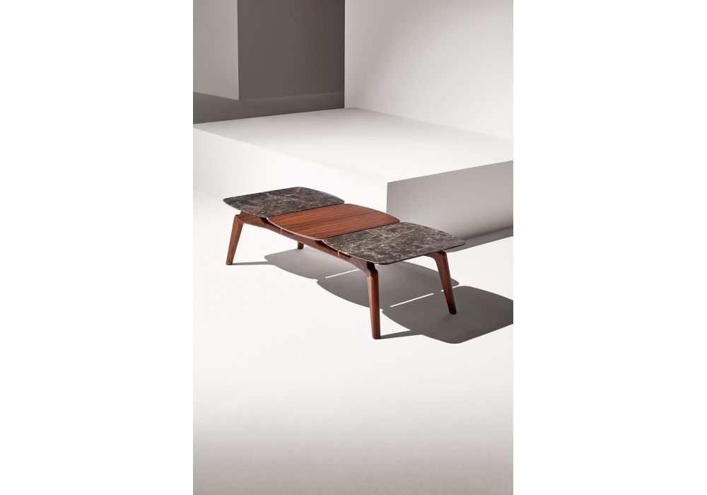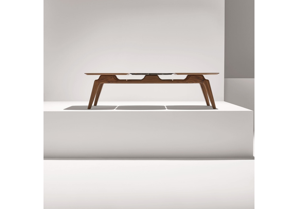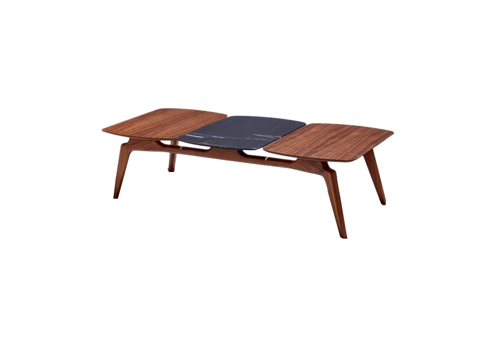 Mesa Mixta Trio, von Andrés Martinez für Nomon entworfen, ist ein Couchtisch mit Beinen aus Nussbaum und einer Platte aus drei Platten aus Nussbaum, Marmor oder in der Kombination Nussbaum/Marmor. Das Oberteil ist in 2 Größen erhältlich.