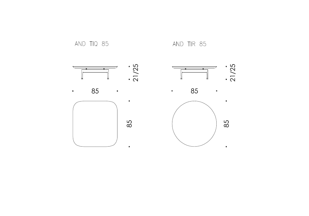 | Abmessungen | - 85 x 85 x H 25 cm; - Ø 85 x H 25 cm. |