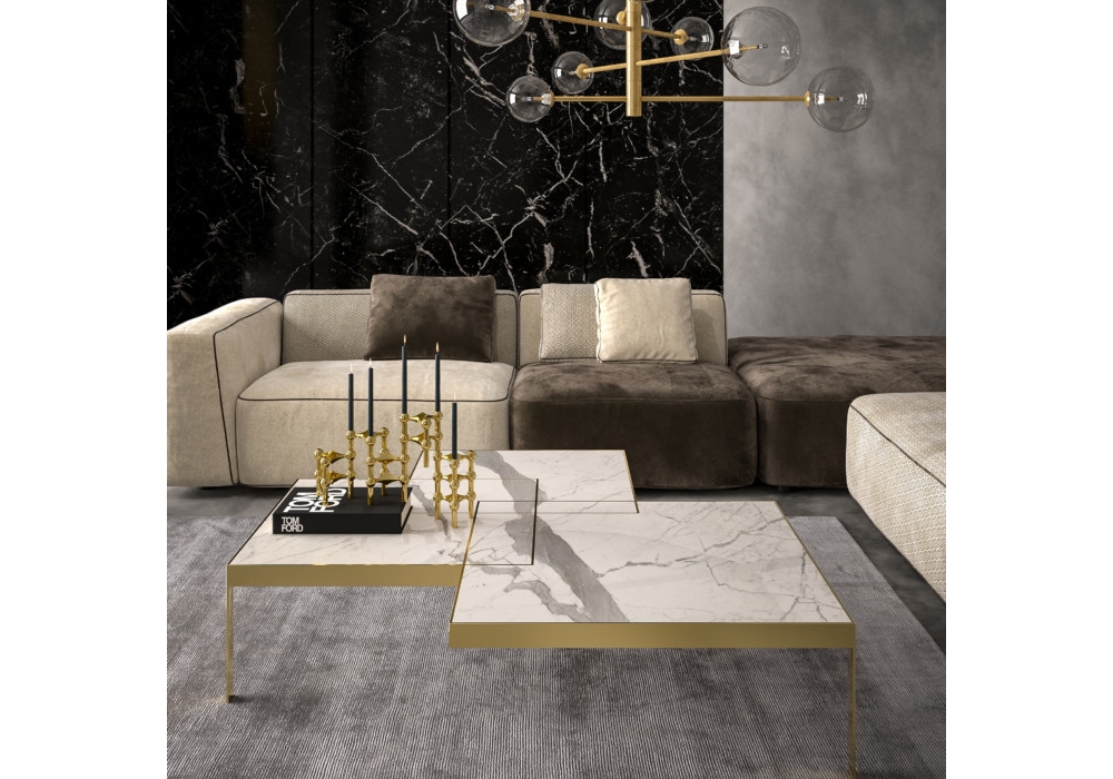 John von Sebastiano Zilio für Kreoo entworfen, ist ein Couchtisch mit Marmorplatte, der aus drei quadratischen Elementen unterschiedlicher Größe besteht, die sich kreuzen. Metallstruktur.