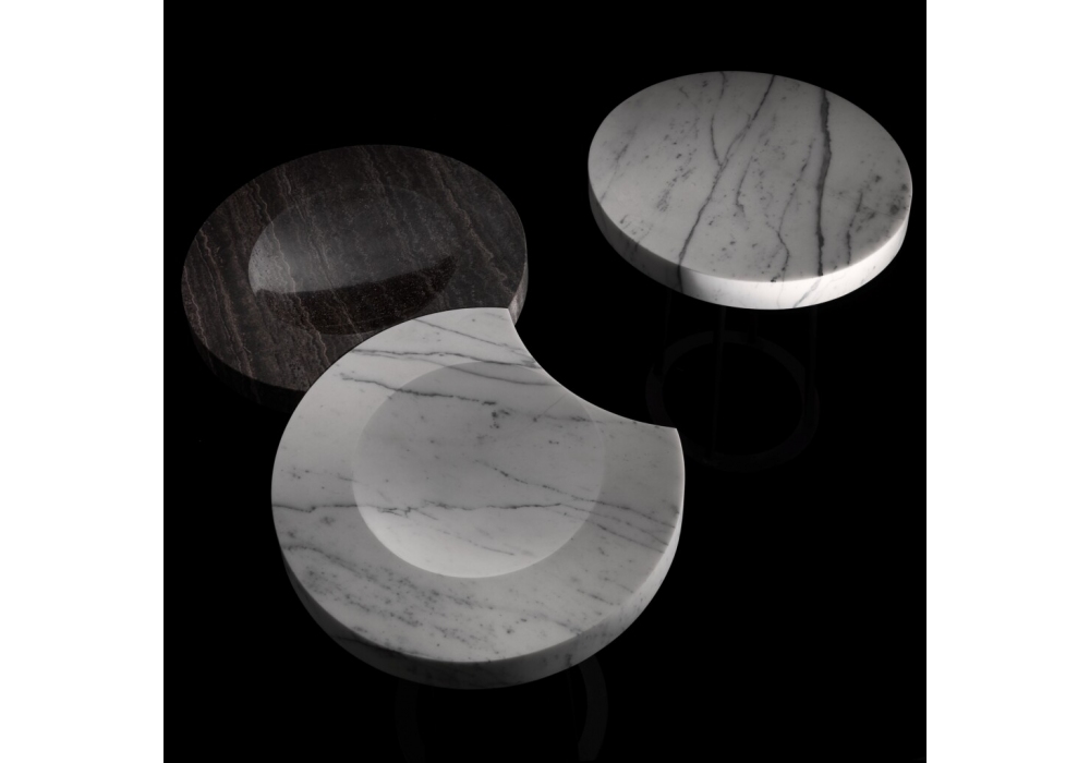 Moon von Enzo Berti für Kreoo entworfen, ist ein Couchtisch mit mattschwarzer Metallstruktur und runder Platte aus Marmor oder Holzfurnier.