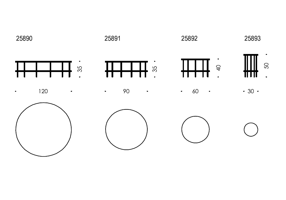 | Abmessungen | - Ø 120 x H 35 cm; - Ø 90 x H 35 cm; - Ø 60 x H 40 cm; - Ø 30 x H 50 cm. |