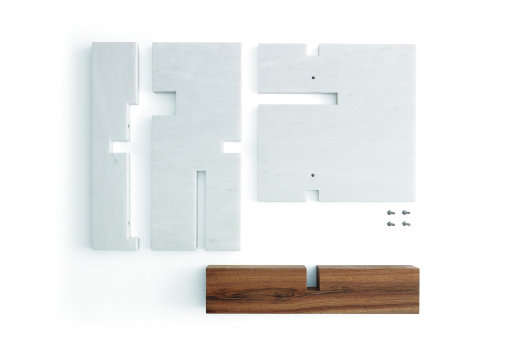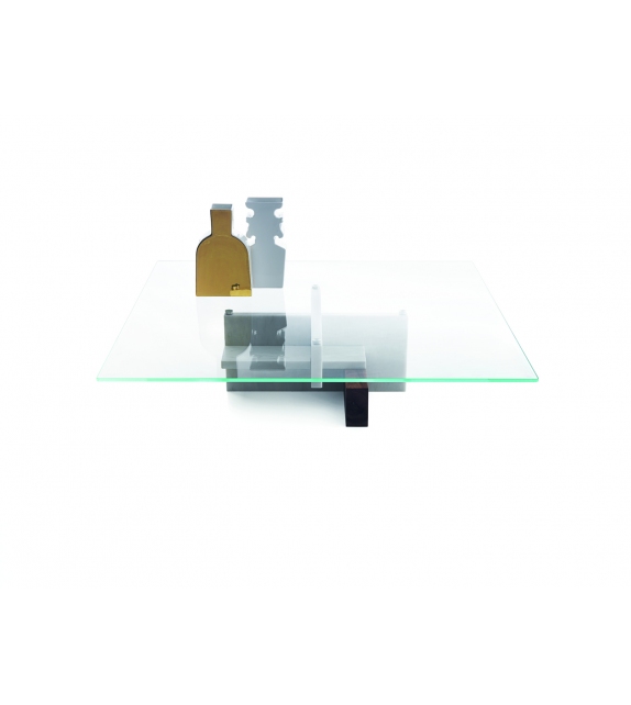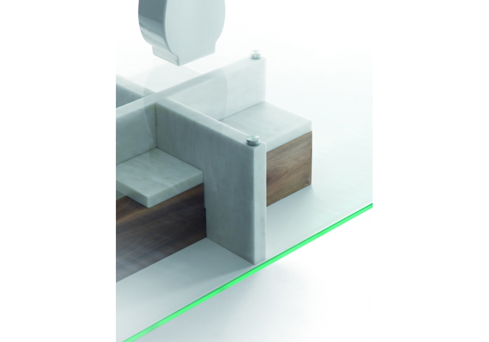 Tangram Mini von Enzo Berti für Kreoo entworfen, ist ein Couchtisch mit Struktur aus Marmorplatten kombiniert mit rechteckigen Holztischen. Glasplatte. Verfügbar in mehreren Abmessungen.