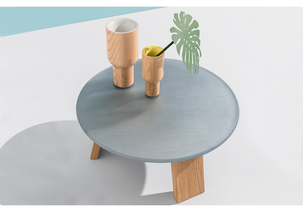 Maya von Lars Beller Fjetland für Discipline entworfen, ist ein Couchtisch mit Platte aus Serena-Stein, Navona-Travertin oder Materia. Beine in Esche natur oder schwarz gebeizt.