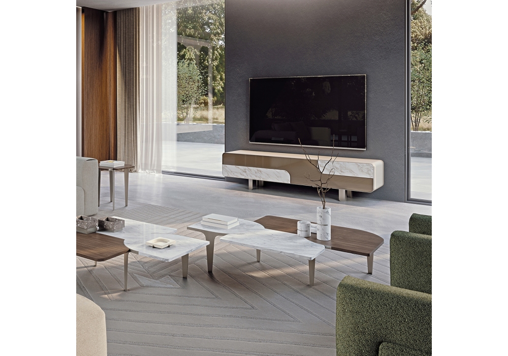 Soul von Giuseppe Viganò für Turri entworfen, ist ein Beistelltisch mit Metallstruktur in mattem Finish. Die Platte ist zweigeteilt und besteht aus einer nussbaumfurnierten Spanplatte oder mit Marmoranteil.