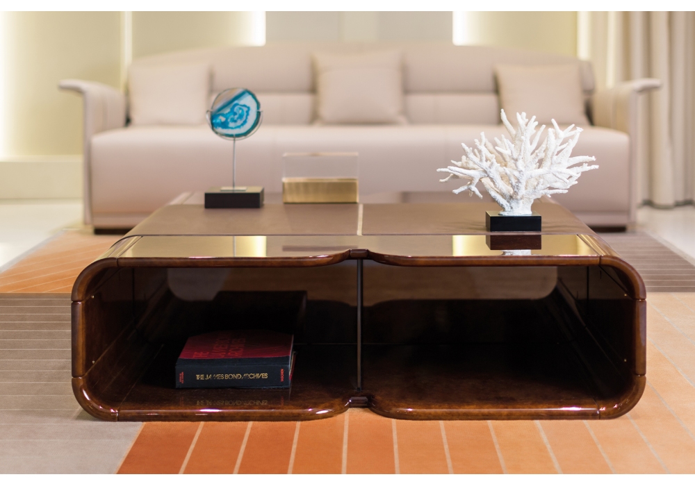 Madison von Andrea Bonini für Turri entworfen, ist ein quadratischer Couchtisch mit einer Struktur aus MDF und Sperrholz mit handdekoriertem glänzendem Polyester-Finish. Auf der Oberseite befinden sich Einsätze aus Leder. Metallbeine in hellgoldenem Finish. In der Struktur gibt es vier Räume, die durch ein bronziertes Glas getrennt sind. Verfügbar in mehreren Abmessungen.