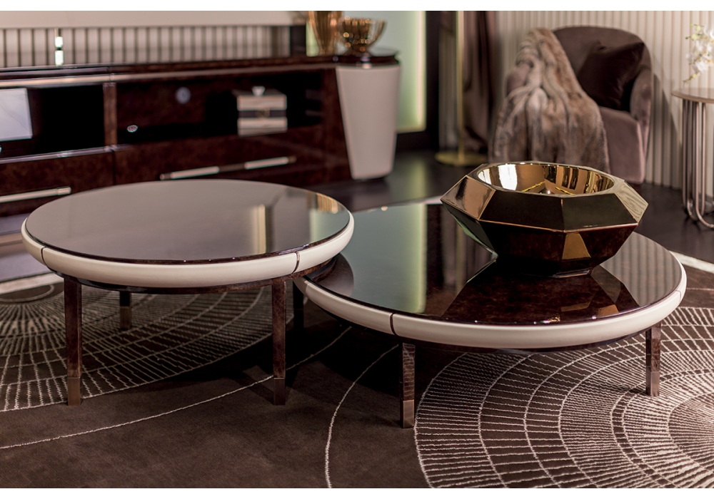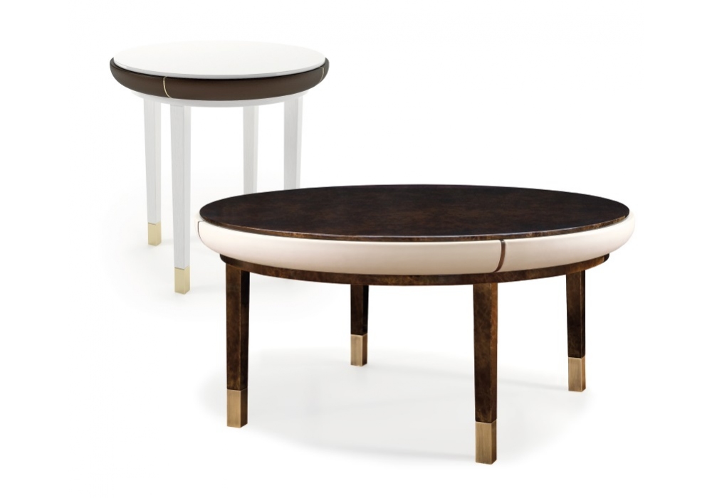 Noir von Andrea Bonini für Turri entworfen, ist ein runder Couchtisch mit Struktur aus MDF und Massivholz mit handdekoriertem glänzendem Polyester-Finish. Platte aus Marmor oder Holz mit verschiedenen Ledern bezogen. Metallteile in hellem Gold- oder Bronze-Finish.