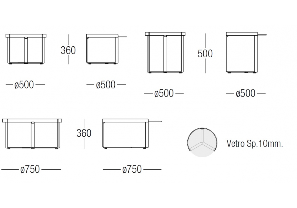 | Abmessungen | Ø 50 x H 36 cm; Ø 50 x H 50 cm; Ø 75 x H 36 cm. |