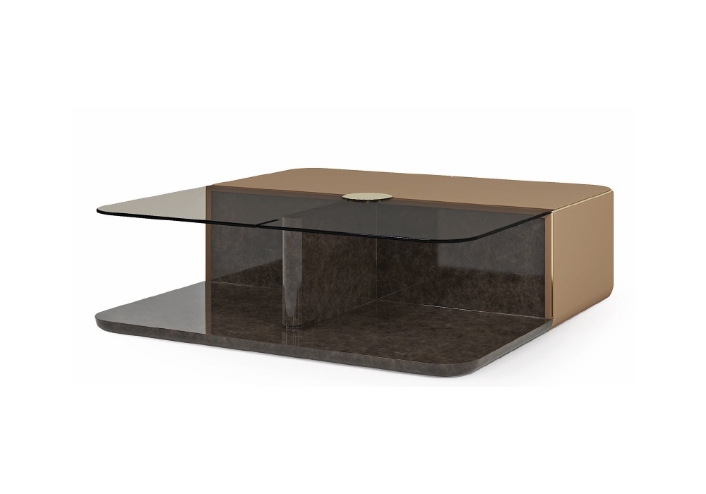 Eclipse von Andrea Bonini für Turri entworfen, ist ein Couchtisch mit MDF- und Sperrholzstruktur in glänzender Ausführung mit Lederbezug. Die Oberseite besteht aus bronziertem Glas. Verfügbar in mehreren Abmessungen.