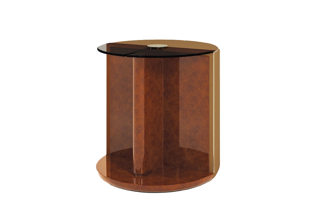 Eclipse von Andrea Bonini für Turri entworfen, ist ein runder Beistelltisch mit MDF- und Sperrholzstruktur in glänzender Ausführung mit Lederbezug. Die Oberseite besteht aus bronziertem Glas.