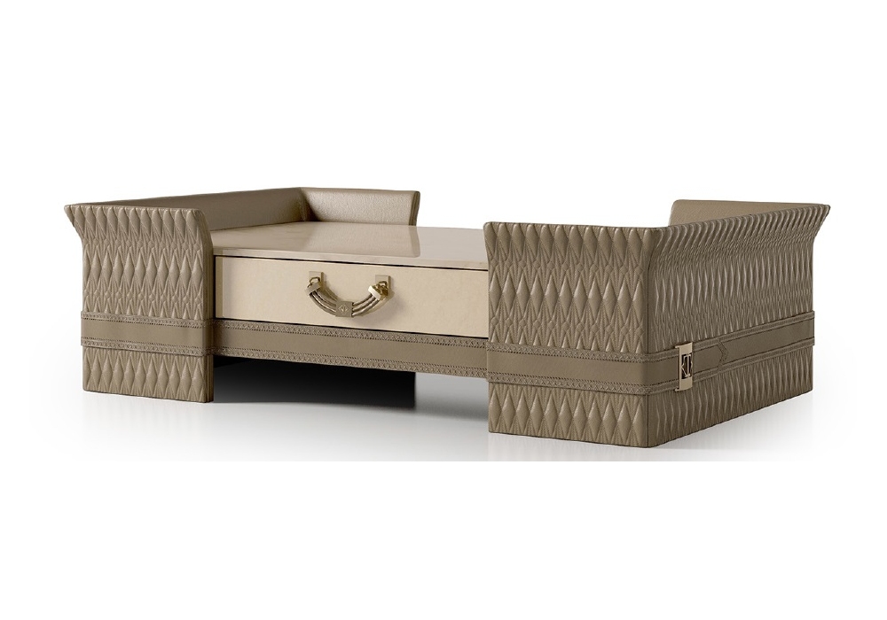 Numero Tre von Roberto Serio für Turri entworfen, ist ein Couchtisch mit Struktur aus MDF, Massivholz, Sperrholz und Spanplatten mit handverzierter glänzender Polyesteroberfläche. Polsterung aus besticktem Leder und Platte aus Marmor oder Holz.