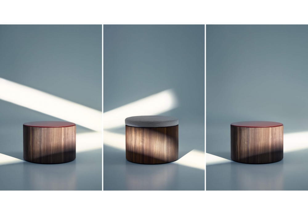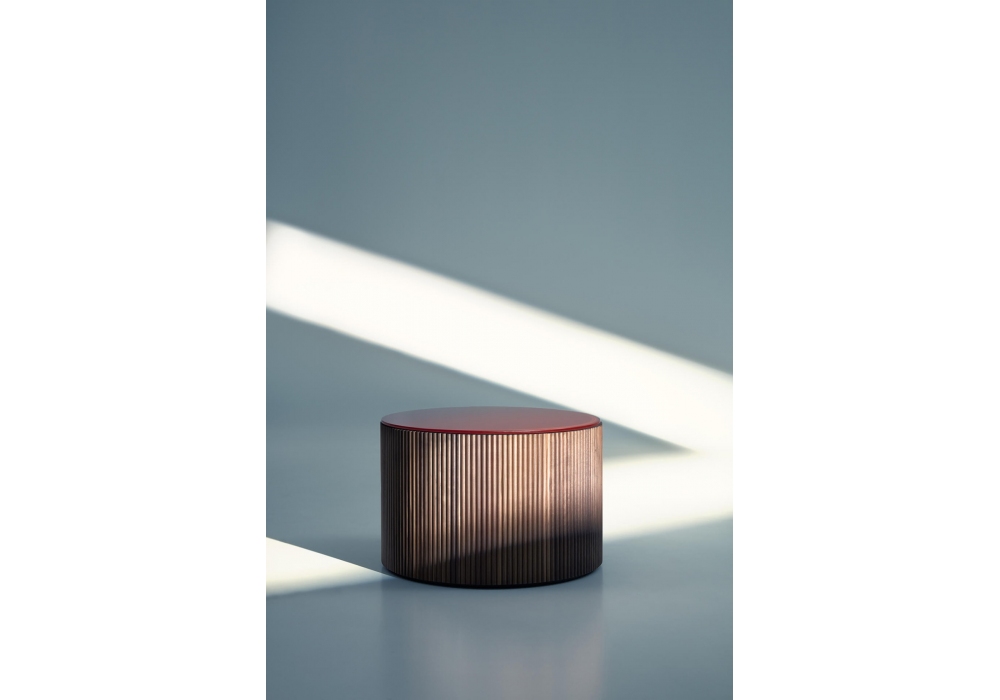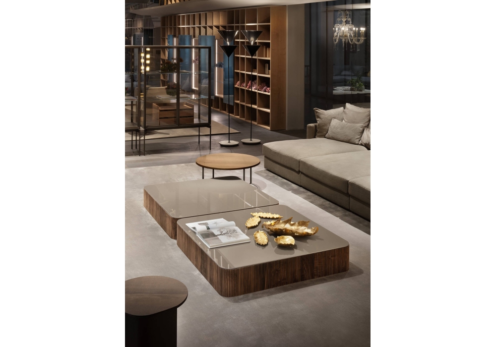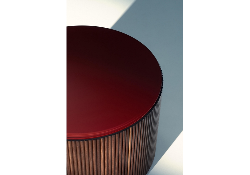 Drum, von Piero Lissoni für Lema entworfen, ist ein Couchtisch mit Struktur aus geripptem Holz, Bullnose-Arbeit aus massivem amerikanischem Nussbaum. Die Platte ist aus Glas oder Marmor in verschiedenen glänzenden oder matten Ausführungen. Erhältlich in verschiedenen Größen.