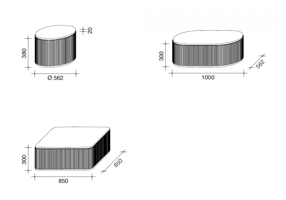 | Abmessungen | - Ø 56.2 x H 38 cm; - 100 x 56.2 x H 30 cm; - 85 x 85 x H 30 cm. |