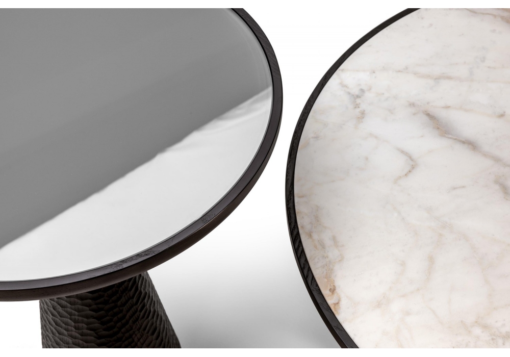 Duo Pedestal Table, entworfen von Roberto Lazzeroni, ist ein Beistelltisch, der aus einer Marmor- oder Glasplatte und einer konischen Struktur aus gebeizter massiver Esche besteht. Es ist in verschiedenen Größen und Ausführungen erhältlich.