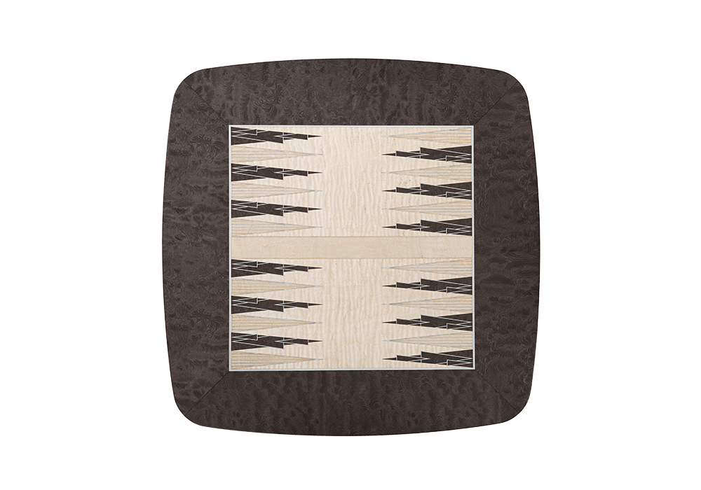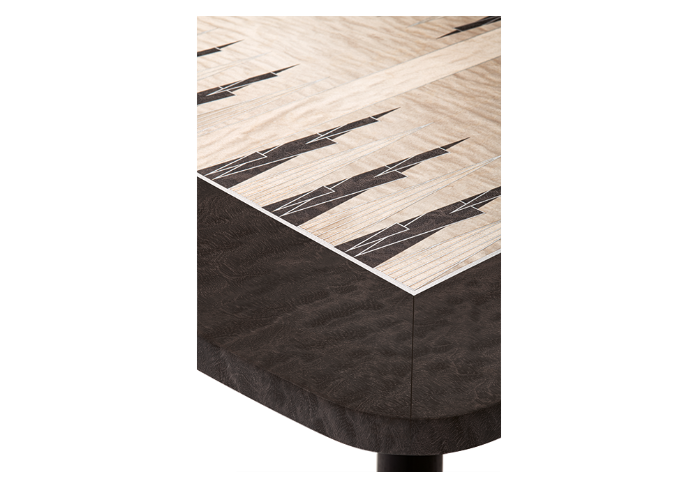 Spark Game, entworfen und hergestellt von Giorgetti, ist ein Couchtisch mit einer Struktur aus zinnfarben lackiertem Aluminium und anthrazitgrauer Esche sowie einer Platte aus anthrazitgrauem Sapelli-Mahagoni und Bergahorn. Erhältlich mit Schachbrett- oder Backgammon-Einlage.