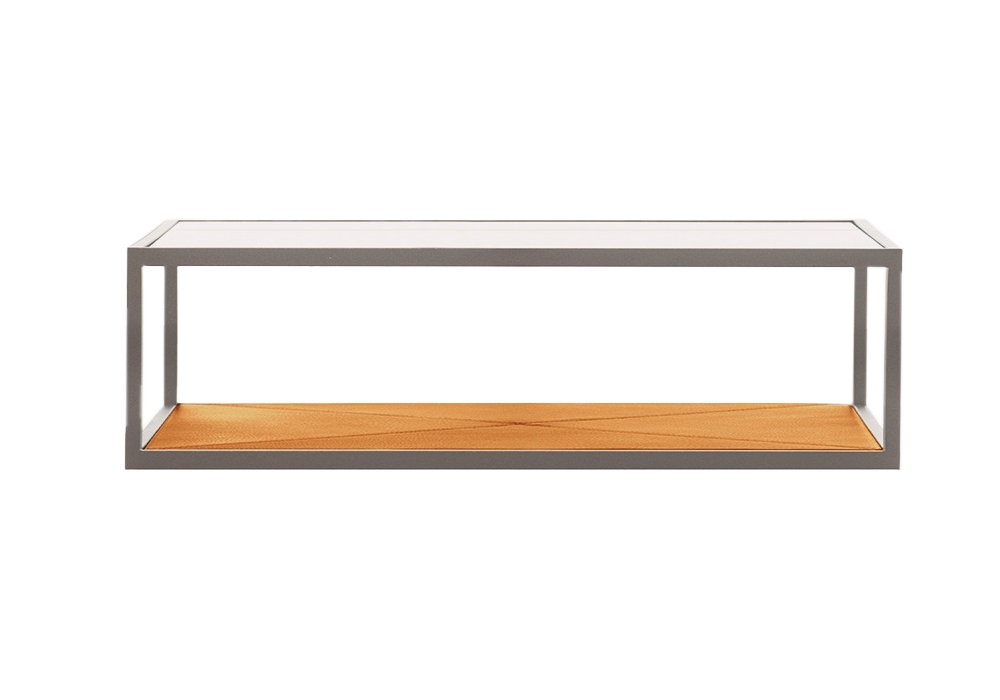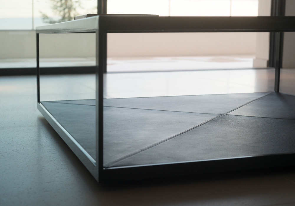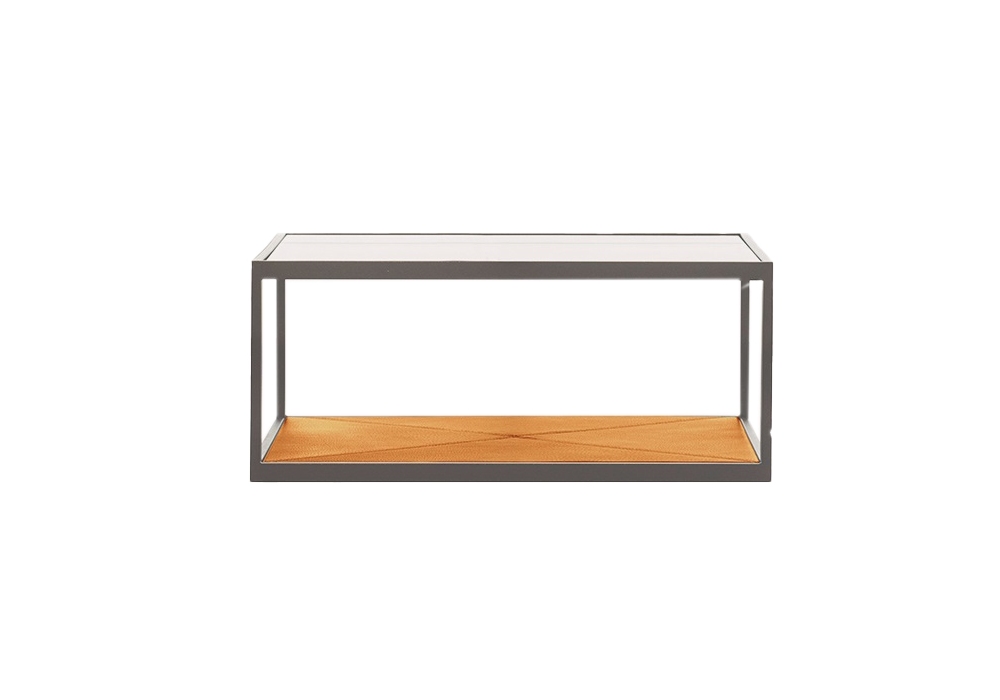 Monaco von Broberg & Ridderstråle für Röshults entworfen, ist ein Couchtisch mit Struktur aus Edelstahl, oberer Platte aus Glas und unterer Platte mit Leder bezogen. Verfügbar in mehreren Abmessungen.