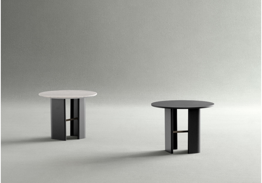Double L von Chiara Andreatti für Potocco entworfen, ist ein Beistelltisch mit runder Marmorplatte und Untergestell aus mit Epoxidpulver lackiertem Stahlblech in geprägter schwarzer Ausführung. Verbindung zwischen den Sockeln aus brüniertem Messing.