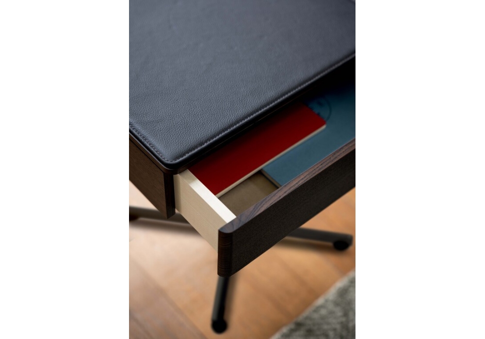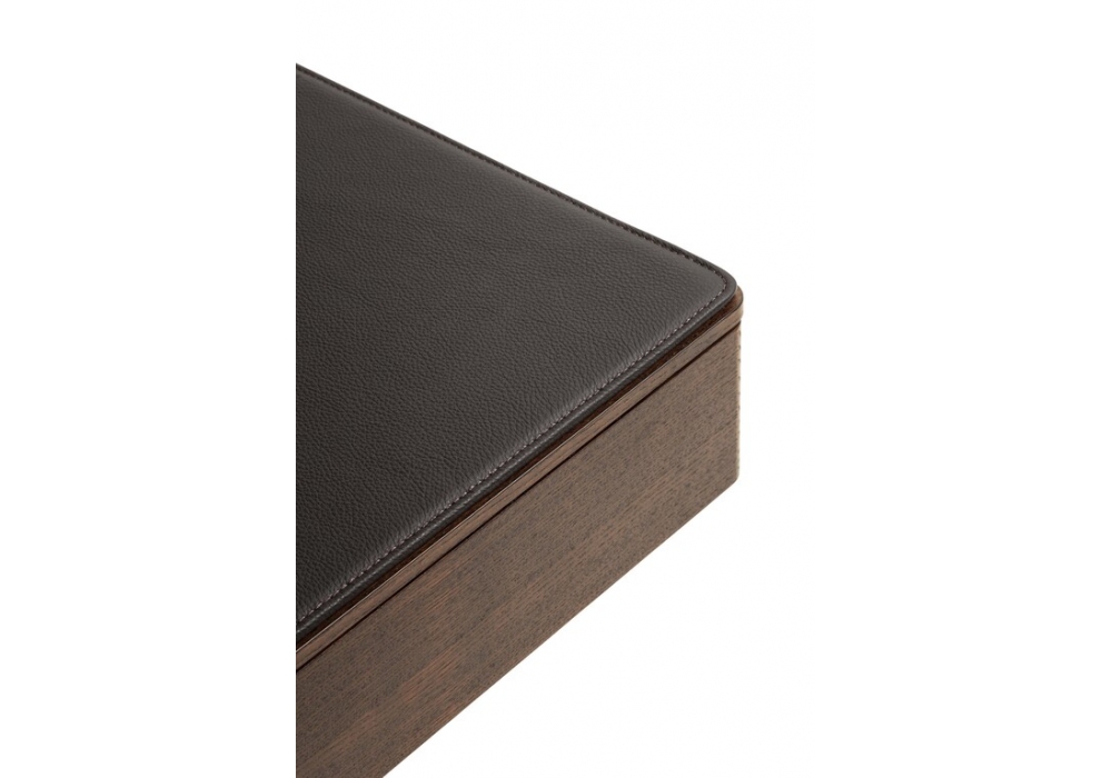 Bob von Jean-Marie Massaud für Poltrona Frau entworfen, ist ein Beistelltisch mit Schublade, ideal als Nachttisch. Der Tisch besteht aus einer mokkafarbenen Tischplatte und einem Gestell aus massiver Esche; Bein- und Kreuzstützbasis aus Stahl. Erhältlich mit oberer Abdeckmatte aus Pelle Frau®-Leder und Schubladenmatte aus beigem Alcantara®.