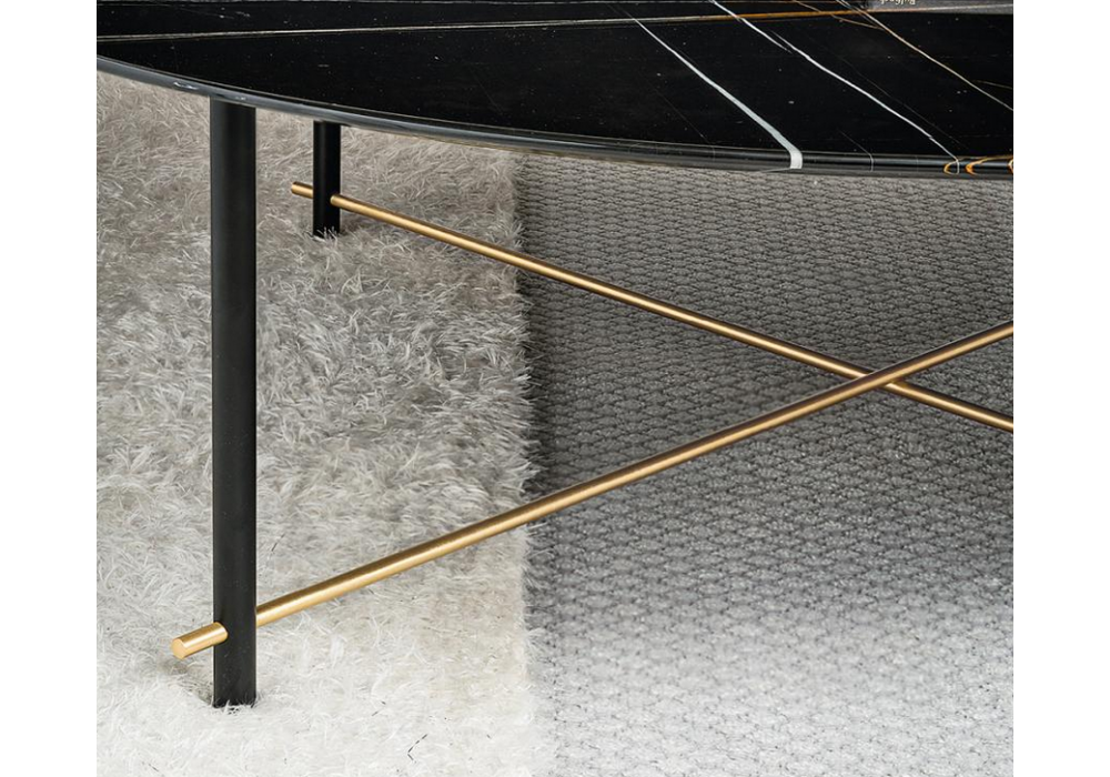 Shanghai von Castello Lagravinese für Casamilano entworfen, ist ein Couchtisch mit Marmorplatte und Untergestell aus mattschwarz lackiertem Metall und gebürstetem Messing.