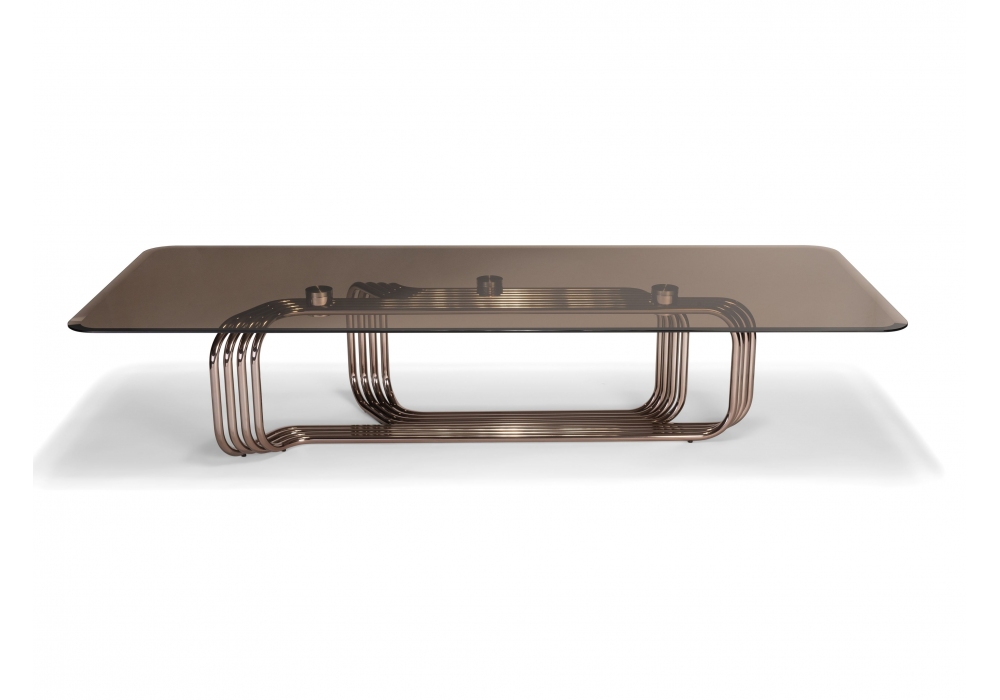 Vincent von Alessandro La Spada für Visionnaire entworfen, ist ein viereckiger Couchtisch mit röhrenförmigem Edelstahlgestell. Die Tischplatte besteht aus Marmor oder gehärtetem Rauchglas. Vincent ist in verschiedenen Ausführungen erhältlich.