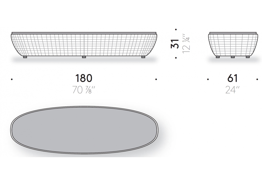 Afternoons von Omi Tahara für Depadova entworfen ist ein Outdoor-Couchtisch mit Aluminiumrahmen und Schale aus honigfarbenem extrudiertem PVC-Geflecht. Die Platte besteht aus Stein und ist in verschiedenen emaillierten oder natürlichen Ausführungen erhältlich. Die Füße bestehen aus thermoplastischem Material.
