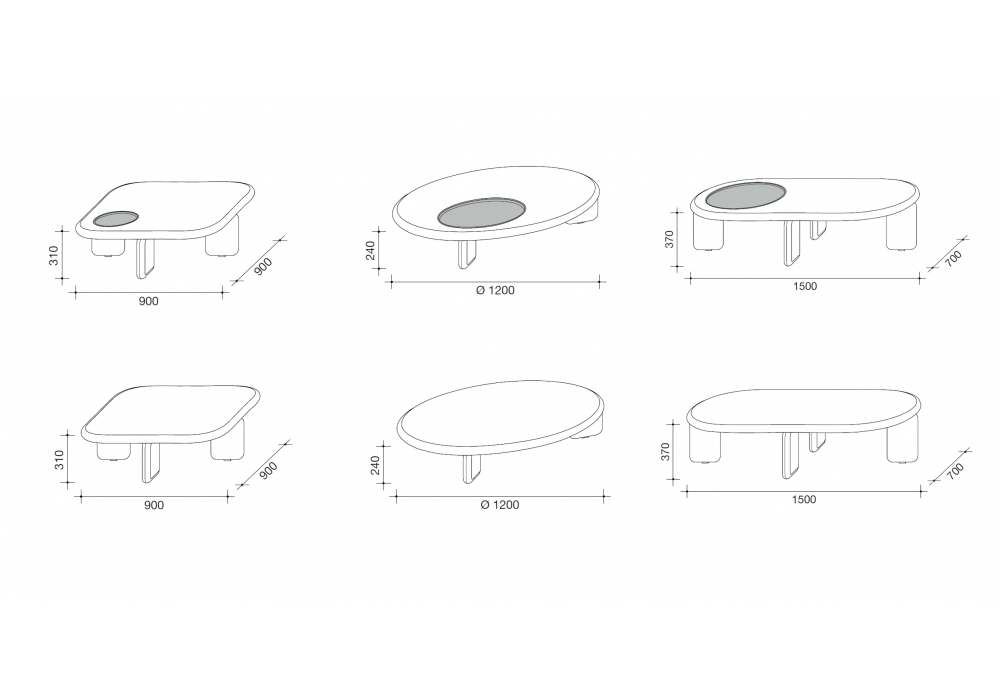 | Abmessungen | 90 x 90 x H 31 cm; Ø 120 x H 24 cm; 150 x 70 x H 37 cm. |