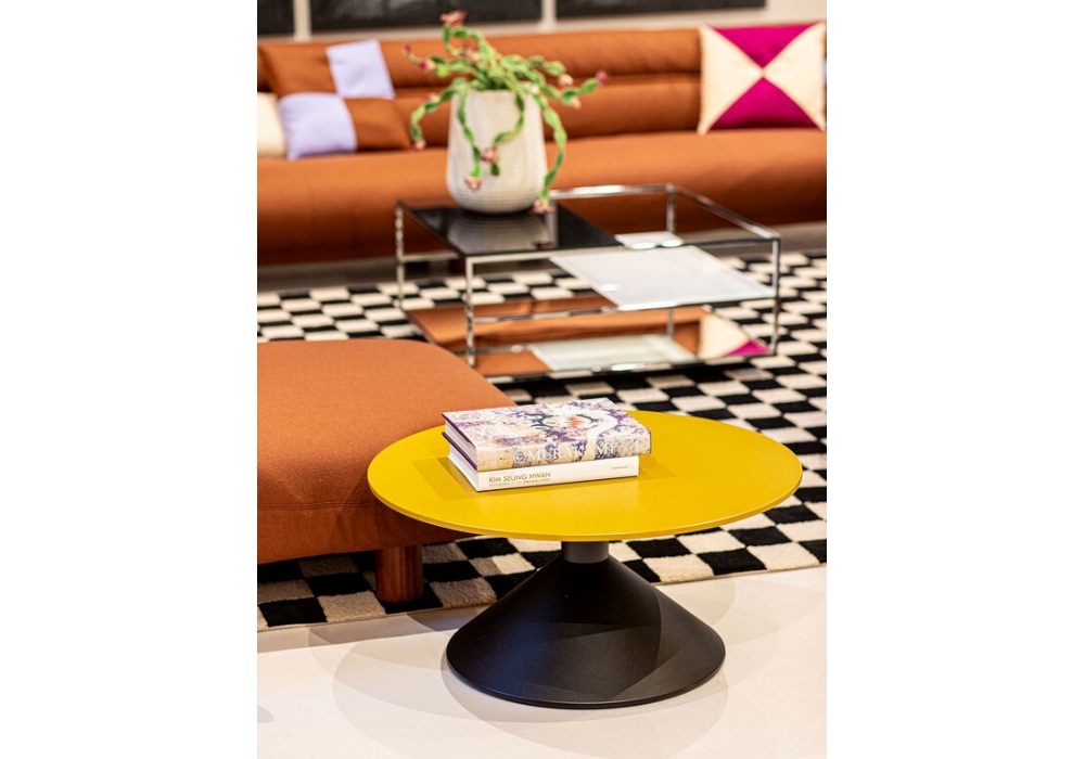 Lud'o Table von Patricia Urquiola für Cappellini entworfen, ist ein Beistelltisch mit konischem Metallfuß und runder, matt lackierter Platte. Bei den Beistelltischen mit einer Höhe von 51 cm (LUT2) ist der Sockel zweifarbig lackiert, sodass der obere Teil des Stiels dem gleichen Finish wie die Tischplatte folgt.