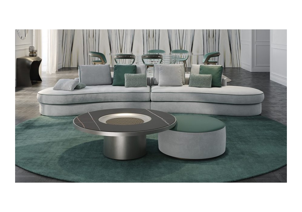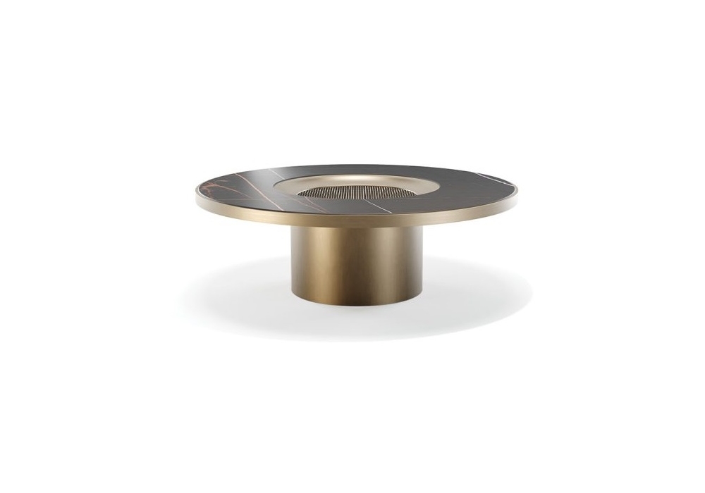 Tau 40 Steel Therasia von Riccardo Lucatello für Reflex Angelo entworfen, ist ein Beistelltisch mit Zylinderbasis in den Ausführungen Bronze, Messing, dunkles Messing und Titan. Holzplatte im gleichen Finish wie die Basis und MarmoReflex/LegnoReflex-Beschichtung mit konkavem Mittelteil aus Mesh-Glas.