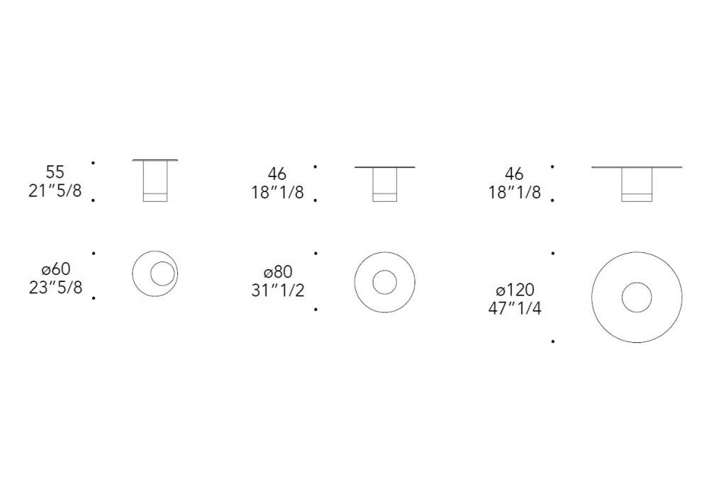 | Abmessungen | Ø 60 x H 55 cm; Ø 80 x H 46 cm; Ø 120 x H 46 cm. |