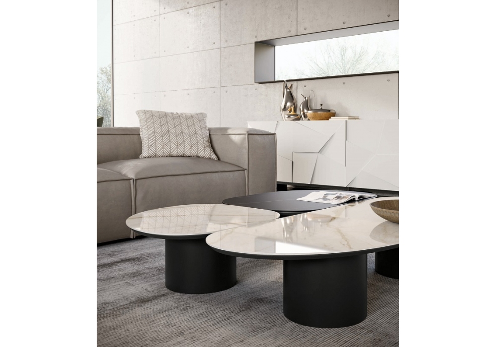 Atollo von Matteo Zorzenoni für Dall'Agnese entworfen, ist ein Couchtisch mit einer geformten Holzplatte oder aus Gres, gepaart mit einer schwarz matt lackierten Holzplatte. Metallbasis. Verfügbar in mehreren Ausführungen und Abmessungen.