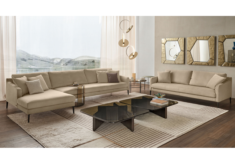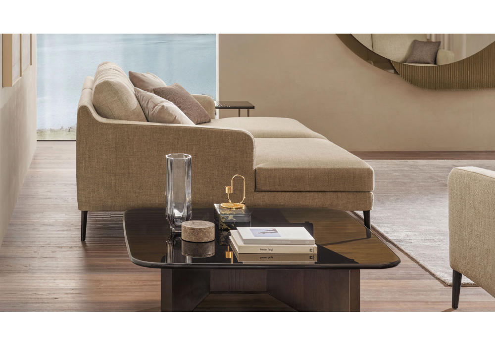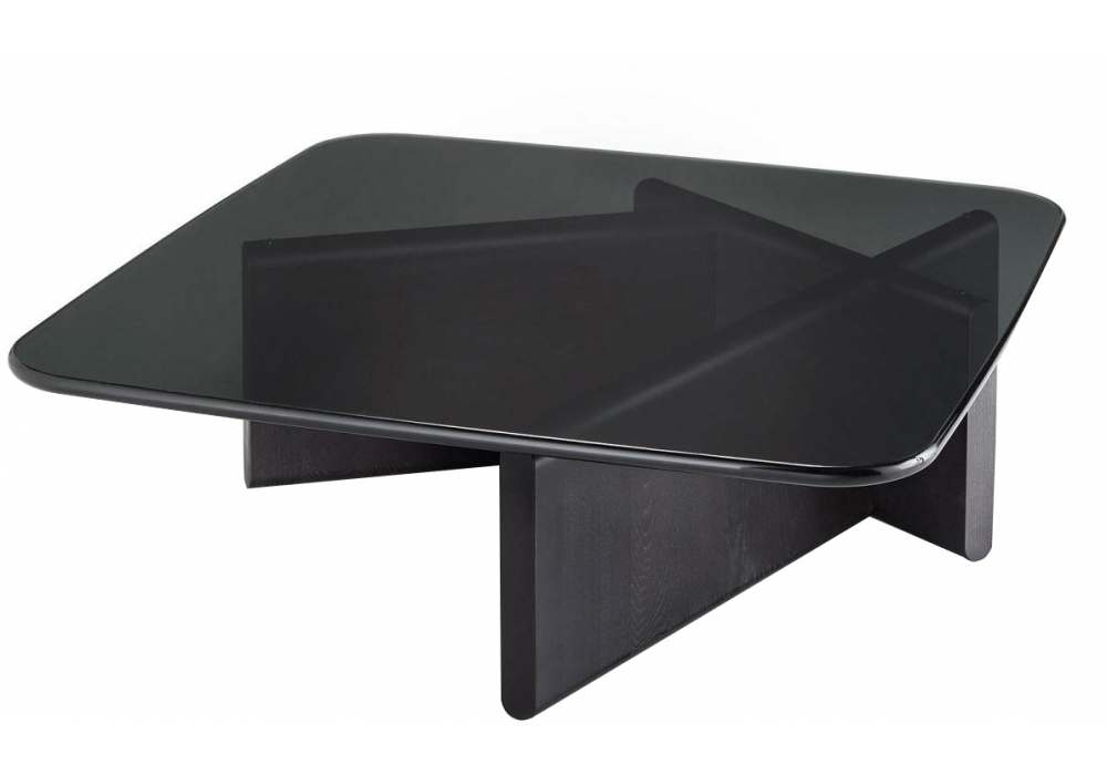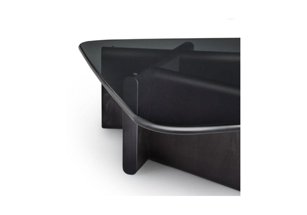 Type von Patrick Norguet für Fiam entworfen, ist ein Couchtisch mit einer Platte aus geschichtetem Glas in Bronze- oder Rauchoptik. Gestell aus Massivholz in der gleichen Farbe wie die Platte (Tabak oder Schwarz).