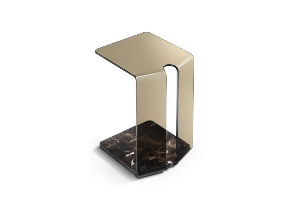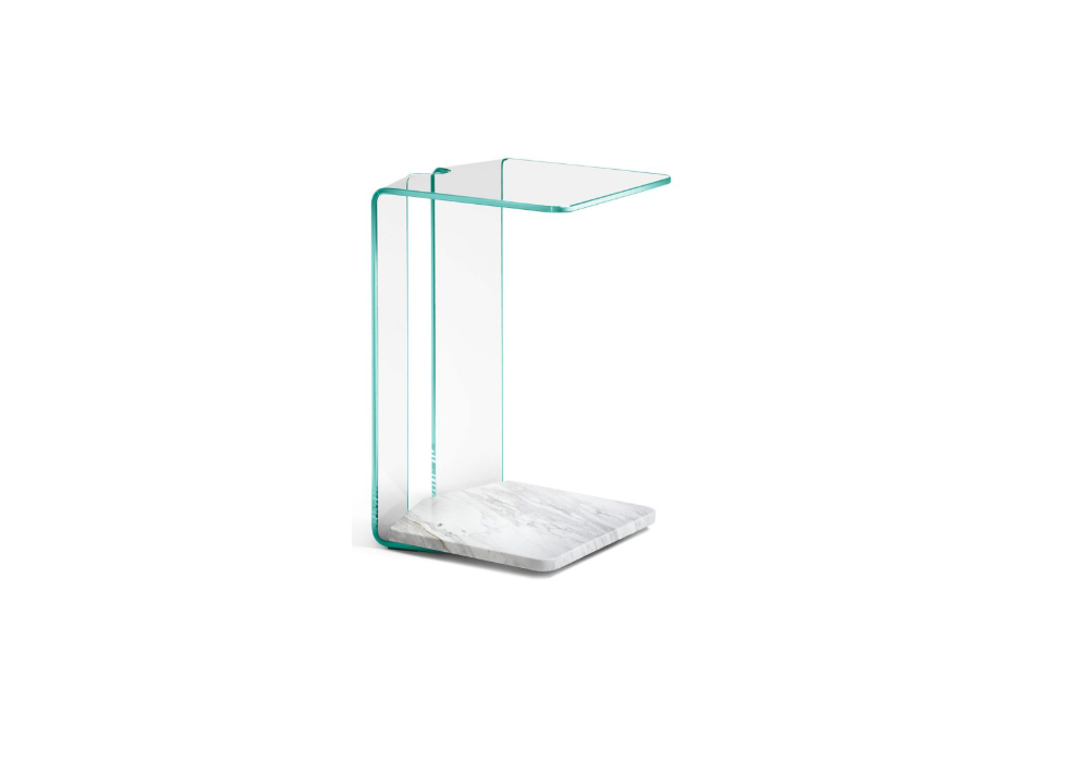 York von Yonoh Studio für Fiam entworfen, ist ein Beistelltisch mit gebogener Glasstruktur, die in den Varianten Extralight, Bronze oder Rauch erhältlich ist. Marmorsockel in verschiedenen Ausführungen.