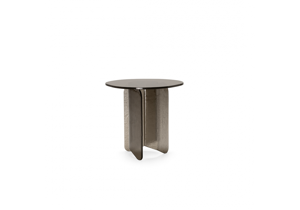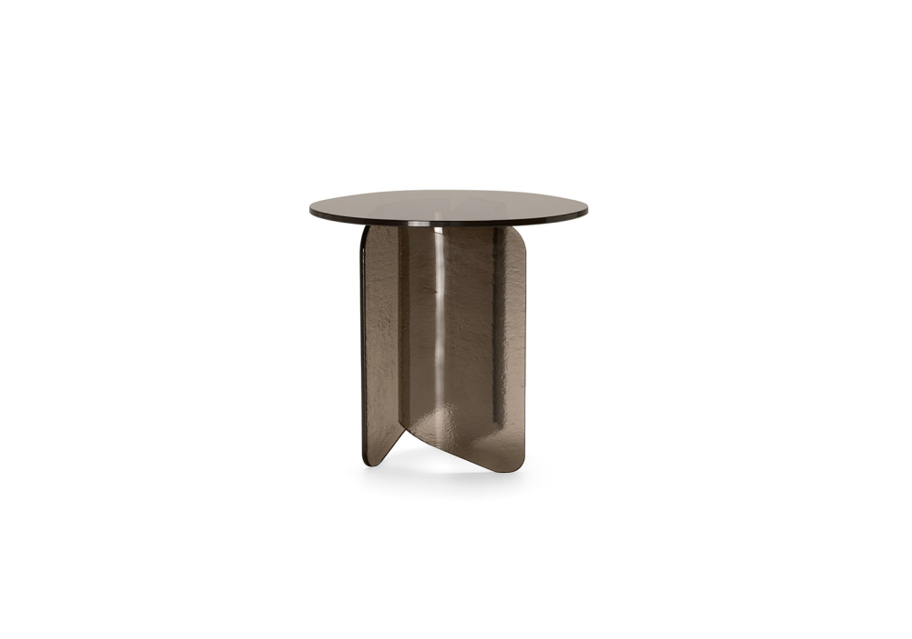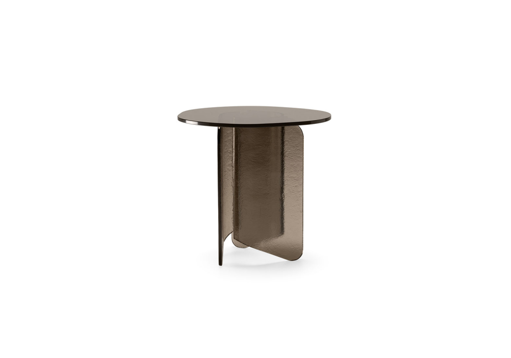 Fleur von Christophe Delcourt für Molteni&C entworfen, ist ein Beistelltisch mit runder Platte aus bronzierter Glasplatte, die auf drei konzentrisch angeordneten, geschwungenen Beinen ruht, die an Blütenblätter erinnern.