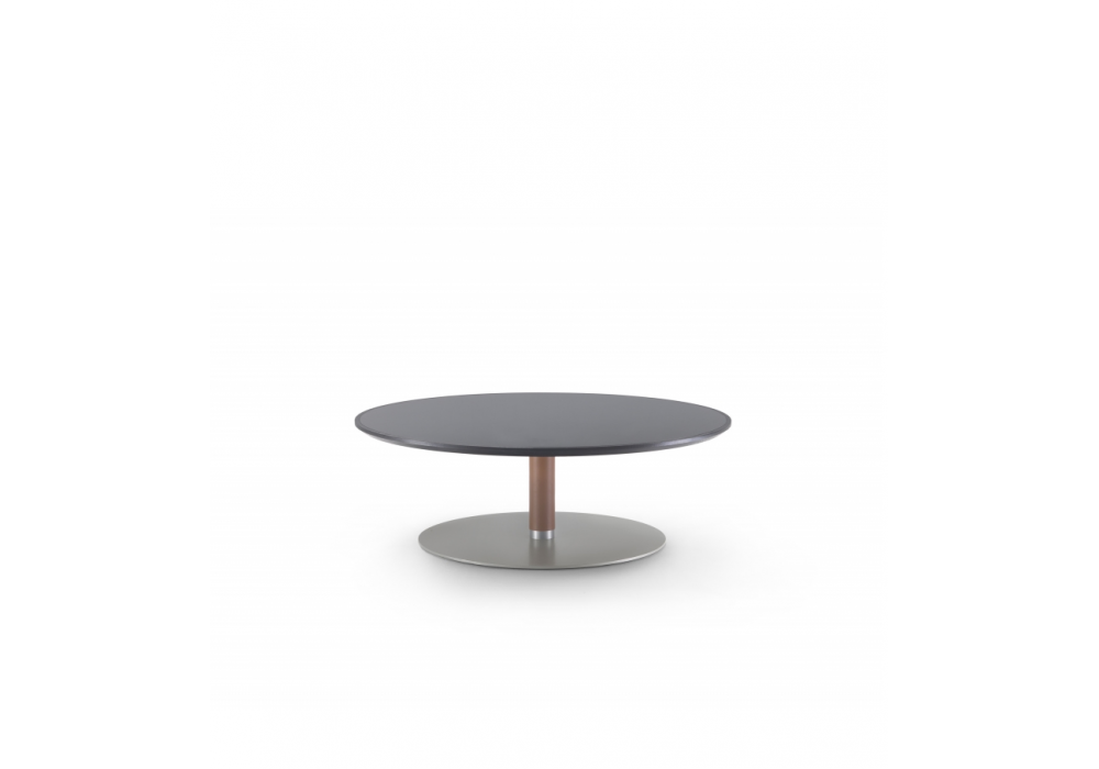 Eri von Fumie Shibata für Flexform entworfen, ist ein Couchtisch mit einer Platte aus massivem Canaletto-Nussbaum und einem Metallgestell. Die Mittelsäule ist mit Leder bezogen. Verfügbar in verschiedenen Ausführungen