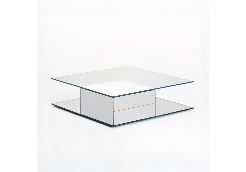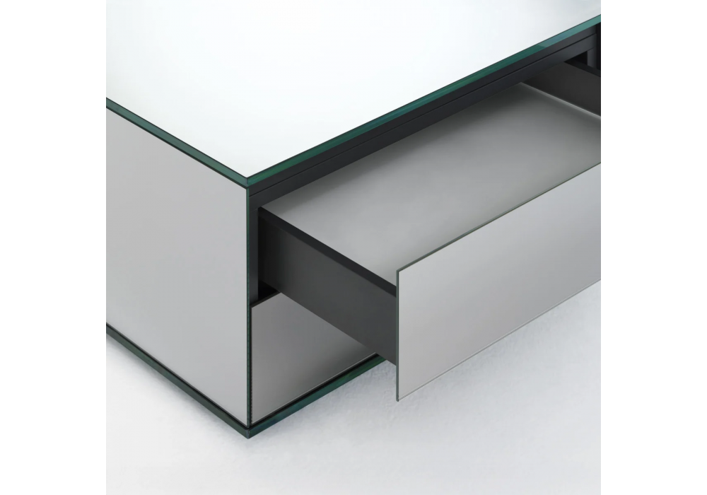 Ollie von Yabu Pushelberg für Glas Italia entworfen, ist ein Couchtisch mit Platte und Untergestell aus 12 mm extraklarem Hartglas. Die Platte ruht freitragend auf einer Kommode mit verspiegelten Push-Pull-Schubladen. Das Untergestell ist komplett versilbert. Verfügbar in verschiedenen Größen.