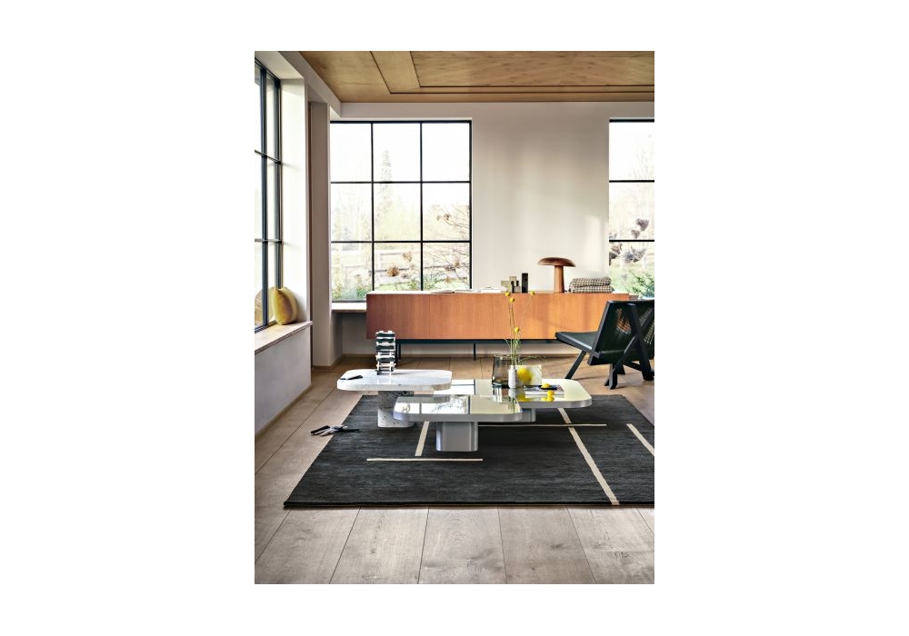 Bow Silver von Guilherme Torres für ClassiCon entworfen, ist ein Couchtisch aus massivem Aluminiumblech, transparent lackiert. Glasplatte, mit Spiegeloberfläche oder schwarzem Lack.