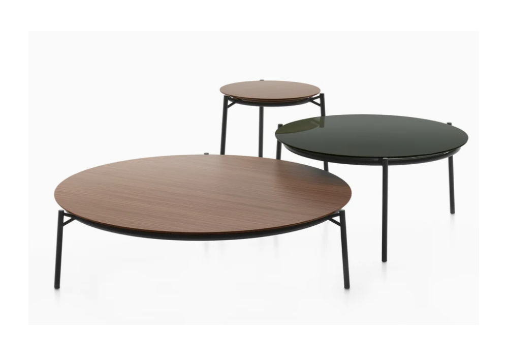 Cantle von Marco Lavit für MDF Italia entworfen, ist ein Couchtisch mit einer matt graphitfarben lackierten Struktur. Platte in Hochglanzlack oder in Holzoptik.