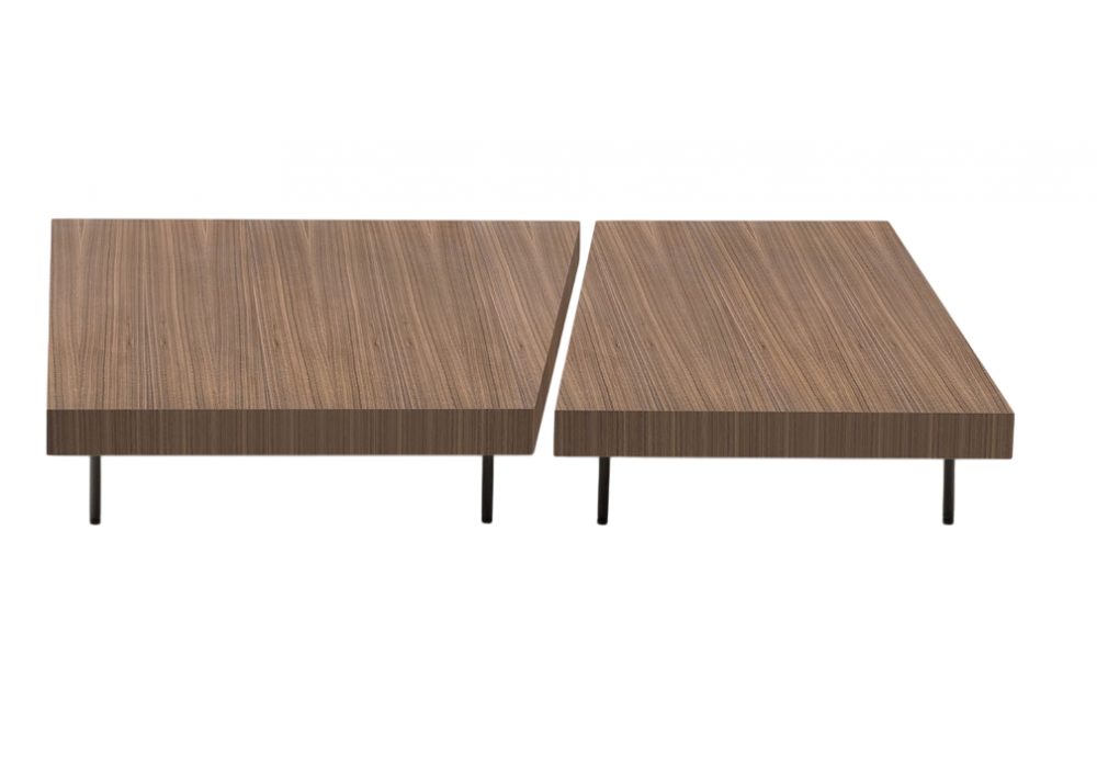 Echoo Design von Piero Lissoni für Living Divani, ist ein Couchtisch mit MDF-Platte und Wabenstruktur, furniert mit tabakfarben gebeiztem Eichenfurnier oder mehrschichtigem Holz in Striped Grey oder Stone Oak® mit Acryl-Finish. Füße aus epoxidpulverbeschichtetem Stahlrohr in Rotgussgrau.