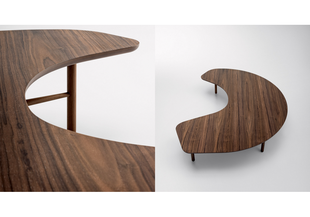 Half Moon Design von Greta Magnusson Grossman für Paola Lent ist ein Couchtisch mit einem Untergestell aus massivem, naturbelassenem Nussbaumholz mit Kunststoffspitzen. Die Tischplatte besteht aus Holzfaser mit einer geformten Kante aus Massivholz in der Farbe des Untergestells.