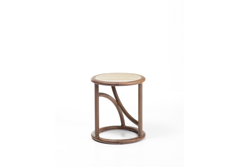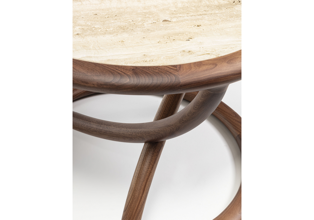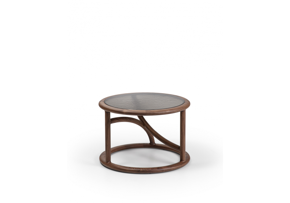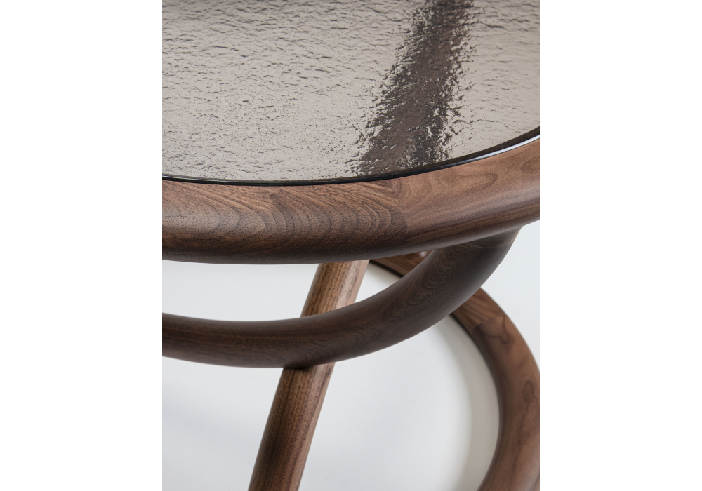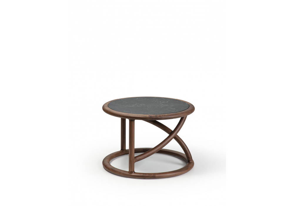 Flip von Andrea Radice für Porada entworfen, ist ein Couchtisch mit einem Gestell aus massivem Canaletta-Nussbaumholz und einer Tischplatte aus Marmor oder thermogeformtem Glas mit Terre-Finish.