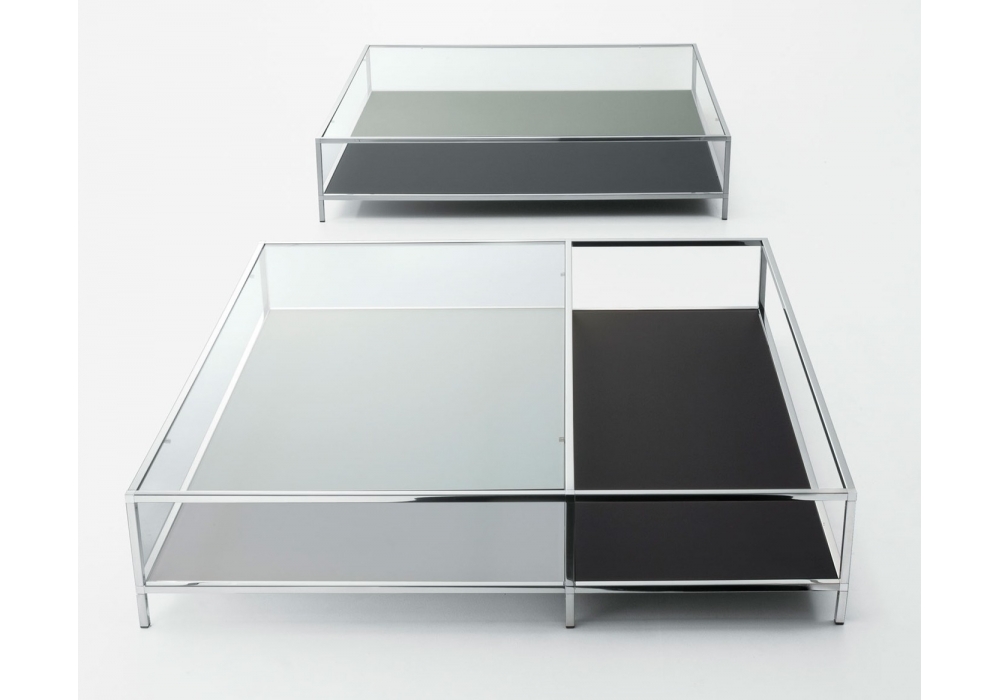 Faraday (F01) von Mârten Claesson, Ola Rune, Eero Koivisto für Gallotti&Radice entworfen, ist ein Couchtisch aus Edelstahl (Inox) poliert. Obere Glasplatte klar 8mm. Untere Glasplatte klar oder lackiert nach Musterkarte. Lackierung jeweils hochglanz oder matt satiniert.
