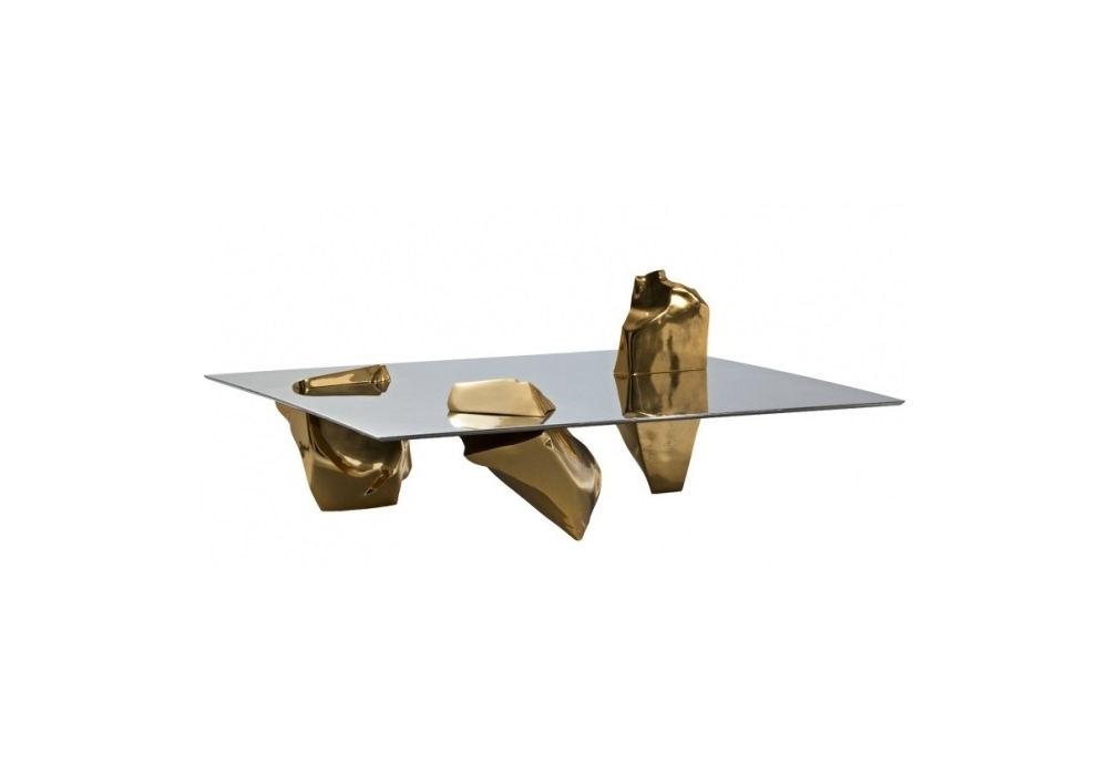 Sereno, von Fredrikson Stallard für Driade entworfen, ist ein skulpturaler Couchtisch mit Metallic-Finish, der mit der Sputtering-Technologie aus Titan und Gold hergestellt wurde. Platte aus 18 mm dicken Holzpartikeln. bedeckt mit dickem Blech aus hochglanzpoliertem Edelstahl. Nur für den internen Gebrauch.