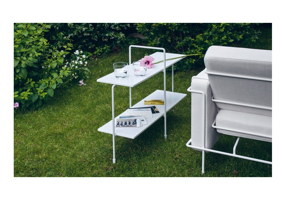 Traffic von Konstantin Grcic für Magis entworfen, ist ein Couchtisch mit Struktur aus lackiertem Stahl, Platte aus Acrylstein mit glatter Oberfläche oder aus naturbelassener oder schwarz furnierter Eiche.