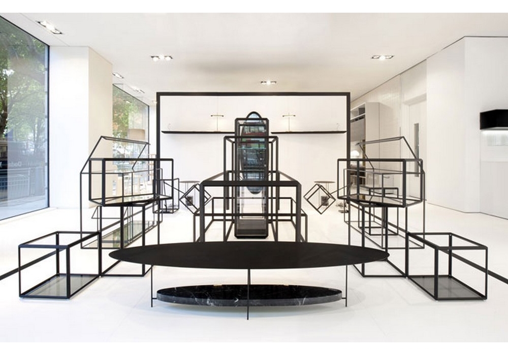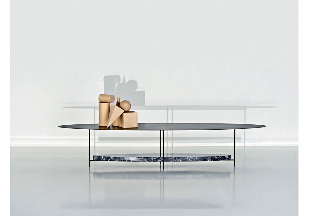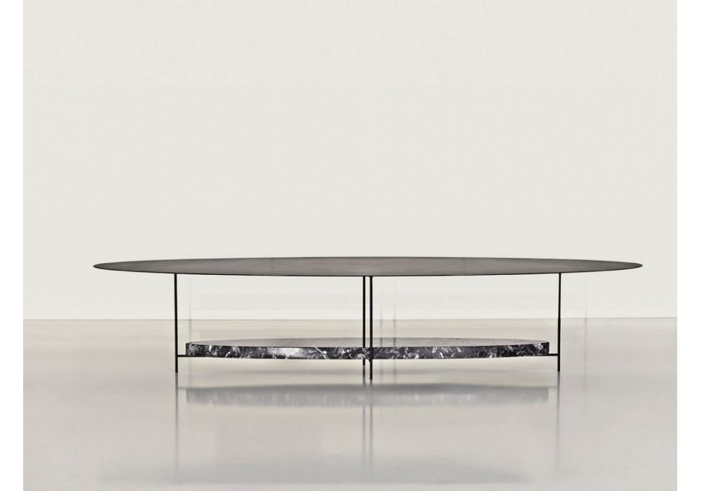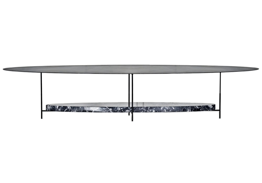 Panna Cotta von Ron Gilad für Molteni&C entworfen, ist ein ovaler Couchtisch, der in zwei Varianten erhältlich ist: schwarz lackiert mit unterem Regal aus schwarzem Marquina-Marmor, weiß lackiert mit Carrara-Marmorregal.