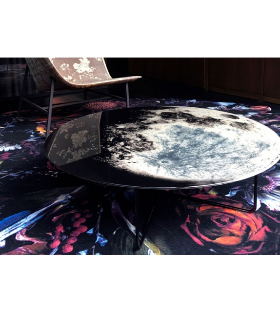 My Moon My Mirror is the low table designed by Diesel with Moroso. Hanging on the wall or in the centre of the room, My Moon My Mirror is your personal piece of the night sky. The moon printed on the mirrored surface combines function and fantasy. Let yourself go and howl at the moon. Glass mirror with safety film, silvery and printed with photographic print.