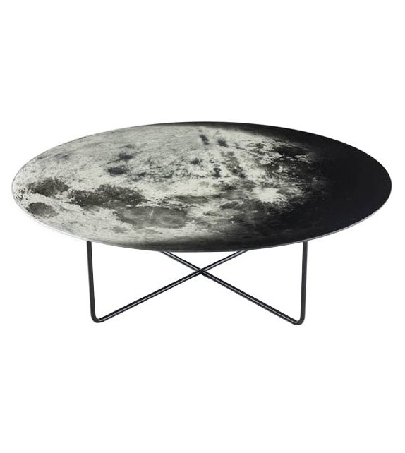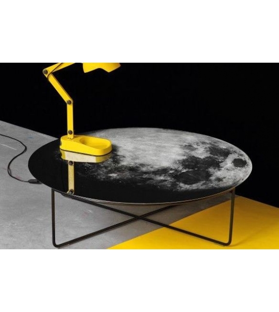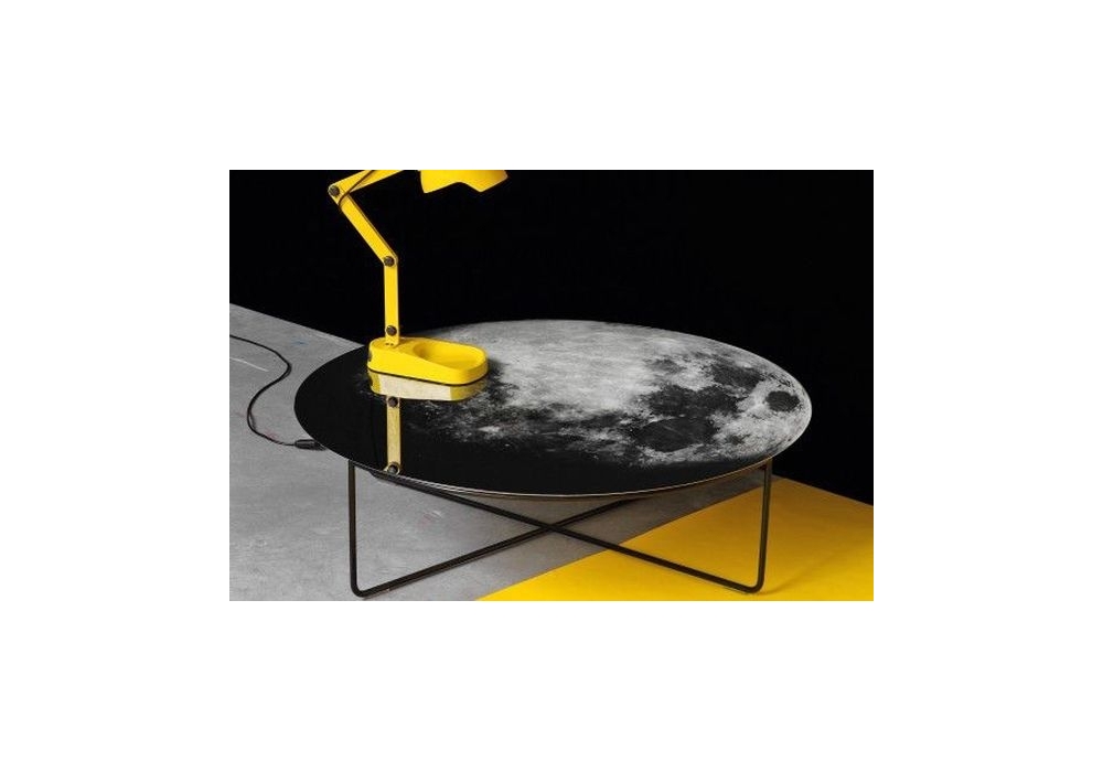 My Moon My Mirror is the low table designed by Diesel with Moroso. Hanging on the wall or in the centre of the room, My Moon My Mirror is your personal piece of the night sky. The moon printed on the mirrored surface combines function and fantasy. Let yourself go and howl at the moon. Glass mirror with safety film, silvery and printed with photographic print. Top in tempered glass mirror silvery and printed with photographic print. Base in varnished steel glossy black.