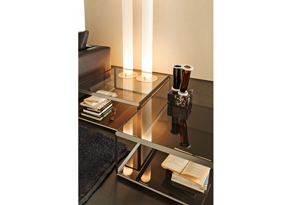 45° von Ron Gilad für Molteni&C entworfen, ist ein Couchtisch mit Metall- oder Holzstruktur, obere Platte aus Glas und untere Platte aus Marmor oder Glas. Verfügbar in mehreren Ausführungen und Abmessungen.